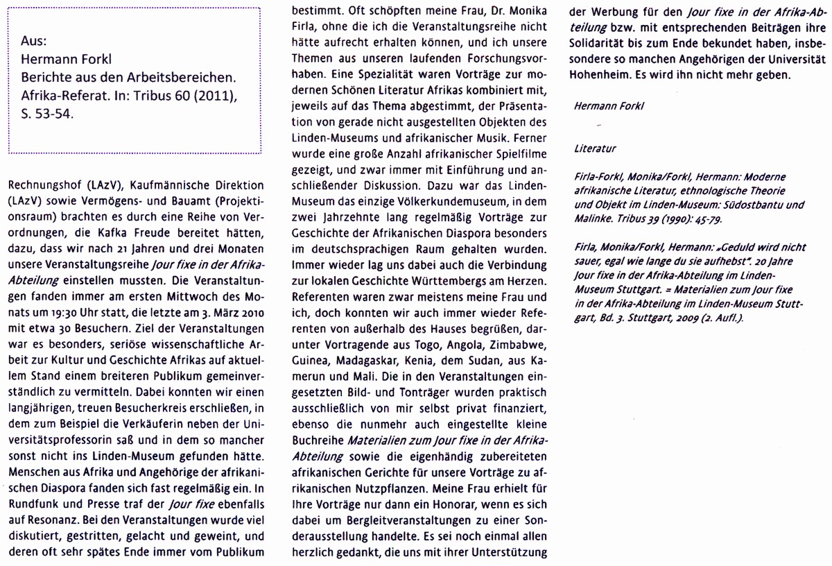 Am 7. Februar 2007 sprach Hermann Forkl im Jour fixe in der Afrika-Abteilung des Linden-Muse- ums Stuttgart unter dem Motto Von der Hirse zur Vanille. Geschmack und Geschichte afrikanischer Kulturpflanzen. Alle TeilnehmerInnen konnten von den essbaren Beispielen probieren.