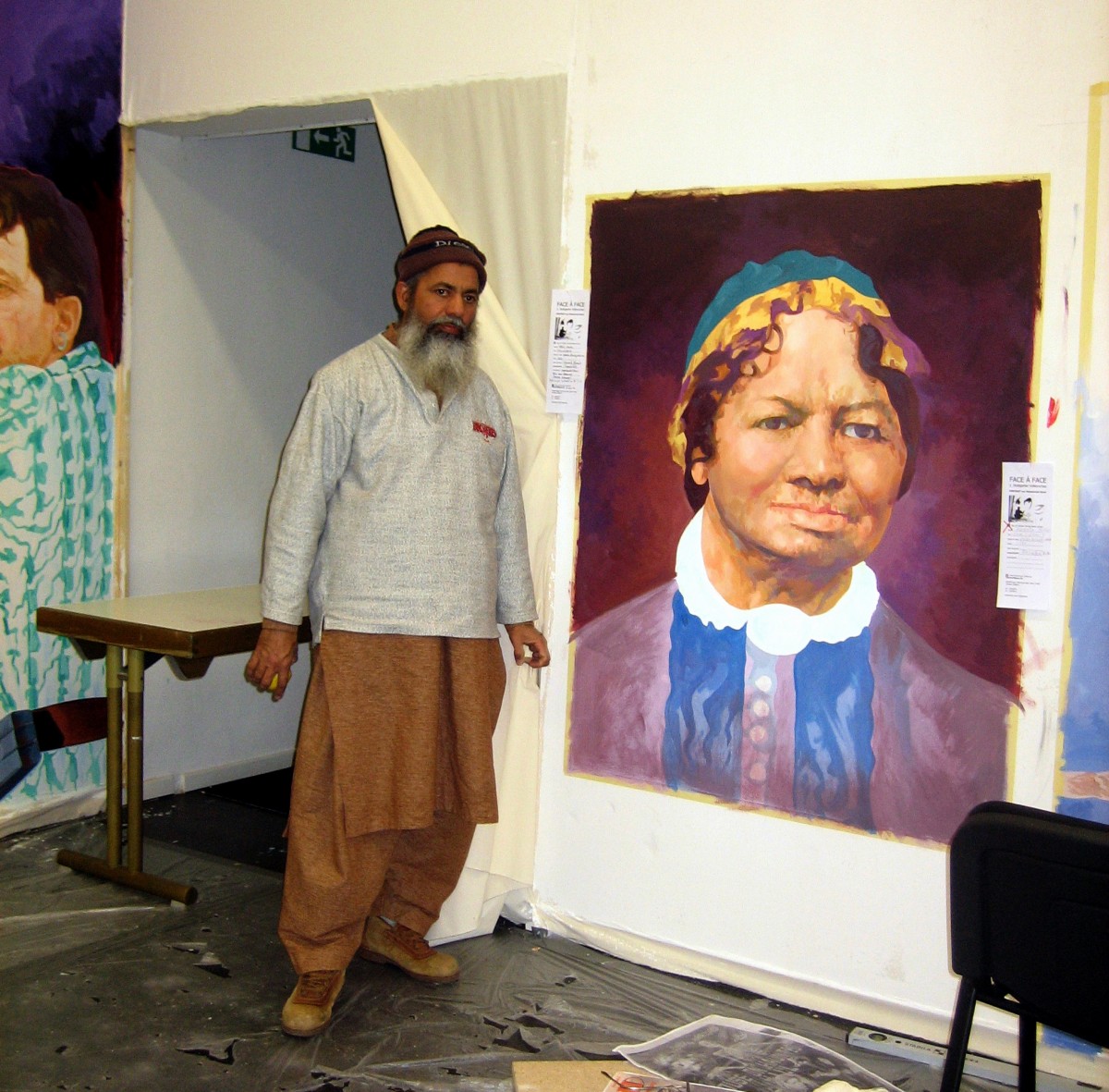 Hier sehen wir den pakistanischen Ki- noplakatmaler Mohammed Ajmal am 5. März 2011 in Stuttgart vor seinem noch unvollendeten Gemälde der Afrowürt- tembergerin Henriette Alexander, die wir schon von unserer Startseite kennen. Ajmal ist der Einzige in seinem Land, der noch seinen anspruchsvollen Beruf ausübt. Vorlage war ein historisches s/w-Photo, das der Künstler auf Bitte der Auftraggeberin nach seinen eigenen Vorstellungen in ein polychromes Por- trait übertrug.